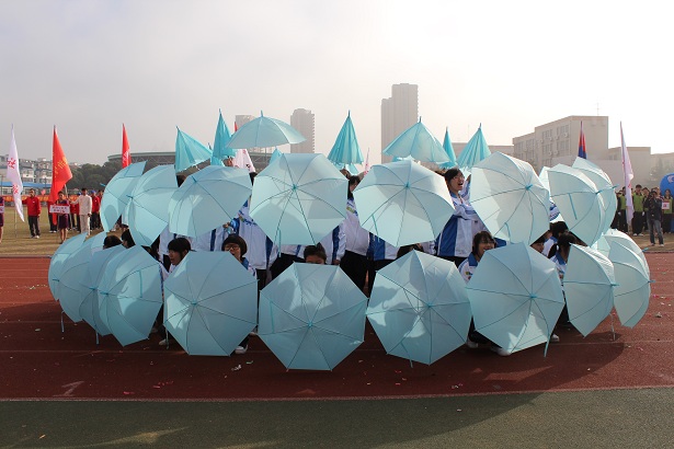 上午8时整,开幕式正式开始。伴随着激情澎湃的乐曲,国旗、校旗、各色彩旗迎风飘扬,英姿飒爽的校徽方队、彩旗方队以及各学院方队统一着装,迈着矫健的步伐,昂首阔步依次进入会场,通过主席台接受检阅。8点20分,艺术学院方阵登场,经过主席台,56名来自不同艺术专业的运动员迅速围成三个同心圆,56把蓝色雨伞瞬间张开,“艺术学院”四个大字由中心缓缓升起,整个方队犹如一朵蓝色的莲花,将“艺术学院”捧上花心。他们的朝气与活力感染了在场的每一个人,场内此起彼伏的口号声一浪高过一浪,把开幕式的热烈气氛不断推向高潮。