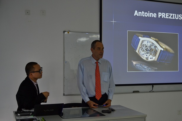 首先,Ivan Coste以Antoine PREZIUSO手表为例讲述了时尚与奢侈品的差别,他告诉我们这款手表要加工两年,手表里包含了十一万个小零件,全世界只有十个样品,大家无不为此震惊。接下来,他又讲述了奢侈品在中国的发展,并表达了他对奢侈品在中国发展前景甚好。通过Ivan Coste老师的讲述,我们明白了奢侈品不是用来炫富的,而是奢侈品本身存在的品牌、内涵以及他的哲学所带给人的身心灵的需求。