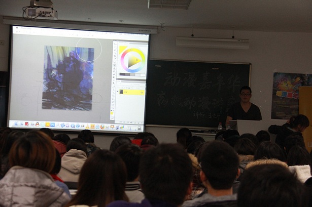 在此次讲座中,王九斤老师首先介绍了自己的职业和他的公司,他是一位概念设计师,而他公司的主要业务涉及欧美游戏和电影、书籍、概念设计、插图等工作。另外,他还谈及到他的设计领域包括场景、角色、汽车、建筑、时尚、平面、字体等。接着同学们提了不少问题,包括设计与绘画的差别、设计的意义、怎样承受学习与生活上的压力,怎样成为一名优秀的设计师等。师生之间进行了良好的互动与交流,同时,王老师对我们未来的发展寄予了很大的期望。