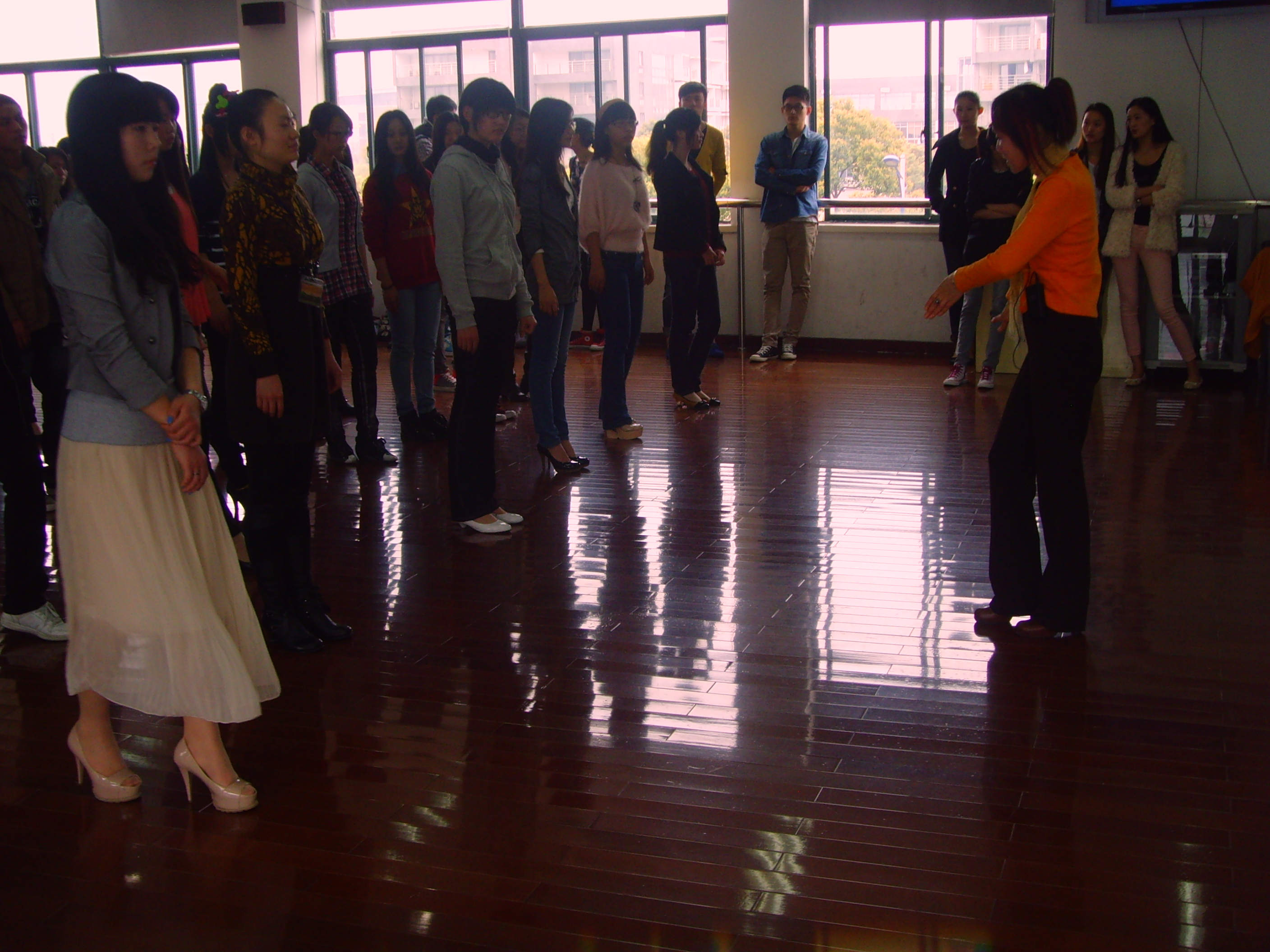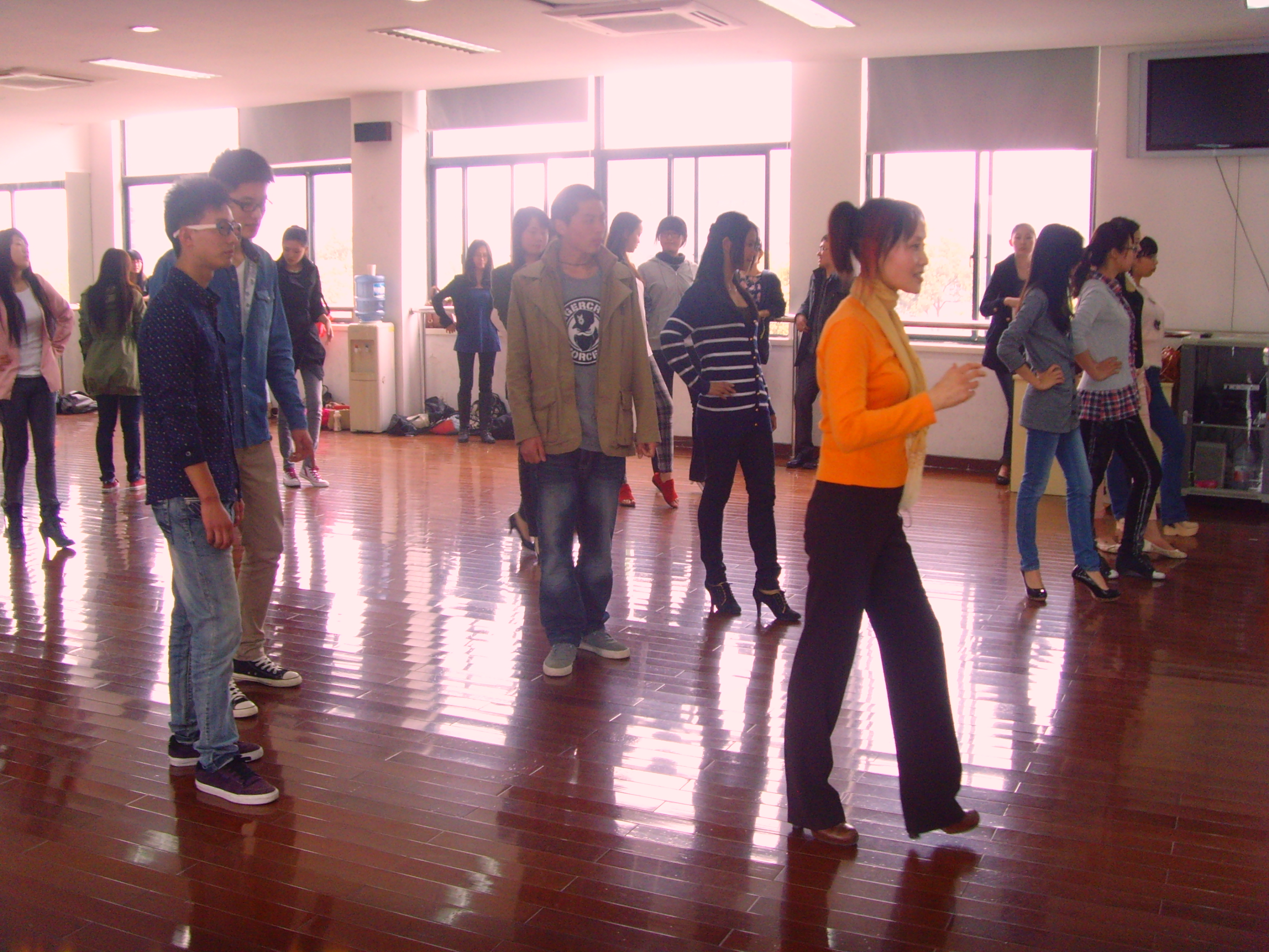 第一次的培训主要是训练同学基本的形体走台,由教授讲解示范之后同学们分组练习。
