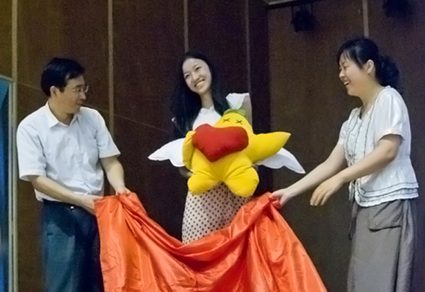 接着由宁正法书记和虞岚老师为我们的2012暑期社会实践的吉祥物乐乐揭幕并由主持人为吉祥物做了介绍:
