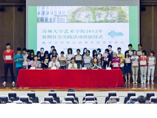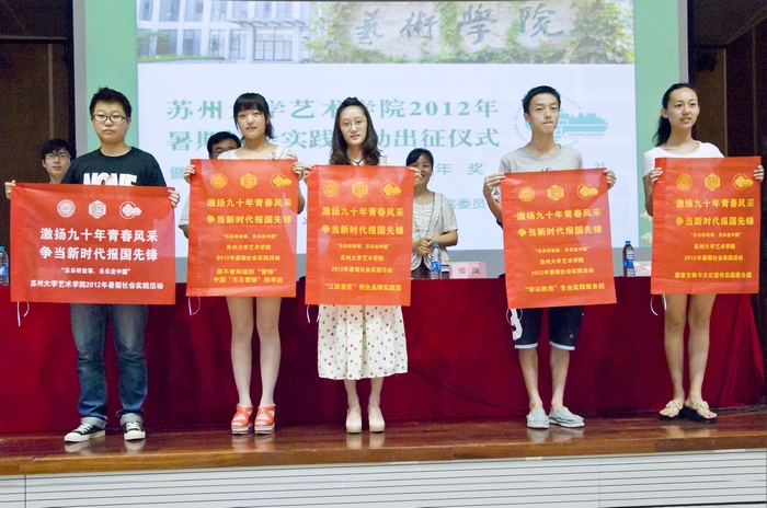 卢海栗老师宣读艺术学院2012年暑期社会实践重点团队名单并由宁正法老师和虞岚老师为重点团授旗。