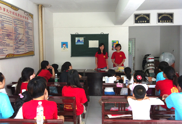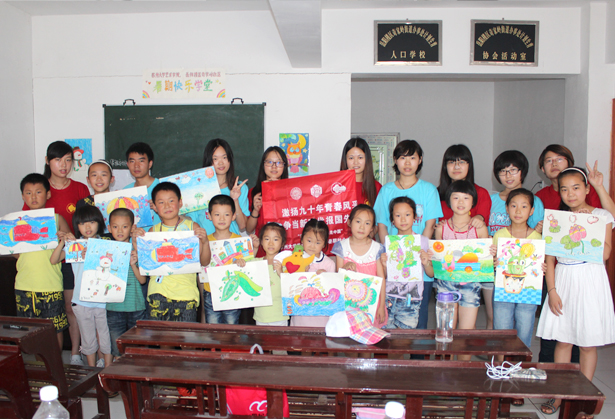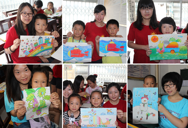 我们的课程分为两大类,上午是美术课,每个小朋友都可以根据自己的想象完成一幅绚丽多彩的儿童画,下午的课程是音乐,音乐课上由于小朋友的识字能力的不同老师将小朋友按照从大到小分为两个小组,分别教他们唱儿歌以及一些歌颂祖国的歌曲。班上的孩子们从五岁到十二岁不等,有十分活跃调皮的也有安静羞涩的,这也让我们的小老师们有些头痛。平日里在家里总是父母顺从自己,而如今在这里却需要我们更加有耐心细心的与他们相处,轻声细语的与他们讲道理。除了与小朋友们的相处之外,我们的同学还面临着更大的挑战,那就是时间!因为希望给这次支教画下完美的句号,我们在最后一天将组织一场小型的文艺晚会,同学们更需要利用平时休息的时间排练节目。虽然辛苦可是当看见孩子们开心的脸庞,我们也就觉得这是有价值的了。其实这次的支教活动不仅是我们来教小朋友画画唱歌,这些天真活泼的小朋友也教会了我们许多,他们天马行空的想象力让我们这些美术生所惊叹,他们纯净响亮的声音更让我们的音乐生折服。