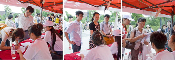 早上五点多钟时,迎新志愿者们就从二期赶到了一期的炳麟图书馆前。虽然天气阴阴沉沉,零星地还飘下几滴小雨,但这却阻挡不了他们迎接新生的热情,带着些许疲惫的脸在看到学弟学妹后立刻精神抖擞了起来:填写个人信息,激活苏大通,打印住宿单,领取生活用品,引导新生去宿舍,一系列流程紧凑而利落。对于新生的情况询问,身为学长学姐的他们都悉心解答,耐心讲解。在接待新生的过程中,时而阴云密布,时而大雨低落,又时而艳阳高照,但大家都面带笑容。一位纤瘦的女生来来回回地为新到的学妹搬了好几回行李,累得满头大汗也毫无怨言。一位男生在接新生的校车来时放下手中吃饭的筷子,引导新生完成报到手续。