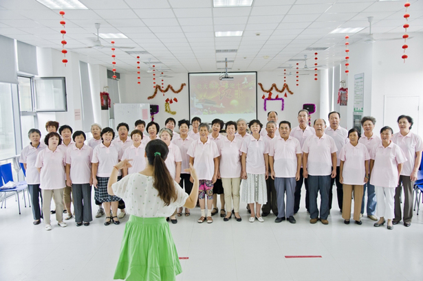 我院音乐教育专业的志愿者同学们担当了此次排练音乐指导工作,排练的合唱曲目为《四渡赤水出奇兵》。随着浑厚沉重的音乐声,女领唱的歌声缓缓地在观众的耳边想起,男指挥员借用他丰富的面部表情和沉稳的肢体动作指挥着在场的合唱成员们。一段音乐之后,男领唱紧接着节奏起唱,领唱与合唱的老人们一唱一和,非常有默契,他们的表演赢得了大家的一致好评。激昂的音乐声,强而有力的节奏唱出了老人们的气势,唱出了他们老年人的精神。