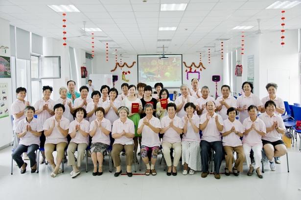合唱排练结束后,老人们又整理了队形,在志愿者的帮助下十分耐心并认真地演练着赛前的上场与下场过程。