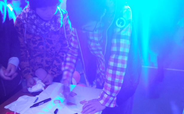 主持人领导各社团单位井然有序的开展活动,带领大家在赞助商OTON区玩游戏,拍照,观看OTON宣传片。接着还有社团展示,各社团展示大家的传统活动:服装社现场手绘T恤,绿色协会手绘购物袋,魔术社表演节目等,丰富多彩。手绘T恤活动一开始,大家便积极参与,画出自己的想法。艺术学院12级辅导员卢海栗老师也被现场热闹的气氛感染,积极参与了大家的活动,并在T恤上展示出他的想法。
