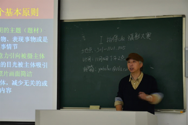 王岩老师在讲座中给大家作了有关摄影知识以及技术的培训。他先提到了摄影的三个基本原则,分别是鲜明的主题、注意力引向被摄主体和照画面简洁,王老师把他自己的作品作为例子,详述了这三个原则在一张摄影作品中的重要性。接着,王老师给大家介绍了照相机的历史与分类,从最早的法国发明的木箱照相机讲起,讲到现代的数码相机,从大画幅的胶片相机到APS-C画幅的数码单反再到卡片相机,王老师讲得语言生动有趣,同学们听得也是津津有味。随后讲到了光圈、快门、景深等摄影的专业词汇,简要说明了什么样的光圈快门适用于什么样的拍摄场景,又以自己的作品来展示拍摄的效果。讲座结束后,王老师给出了简短的提问时间,同学们也是踊跃的上台提问,如何来用好手中的单反,为了让同学们更好地享受摄影、体验摄影带来的乐趣。