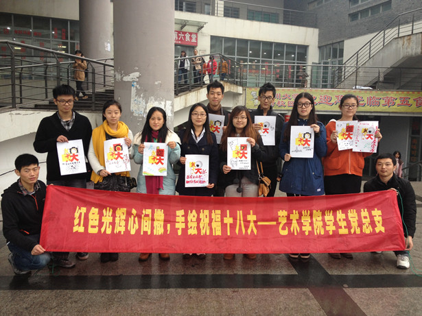 2012年11月16日,为热烈庆祝党的第十八次全国代表大会的召开,继续深入开展创先争优活动,切实增强党组织的吸引力和凝聚力,展现艺术学院广大学生党员的良好形象,紧扣艺术学院工作实际,发挥艺术学院特色,苏州大学艺术学院在校五食堂开展了 “红褐色光辉心间撒,手绘祝福十八大”的党日活动。
