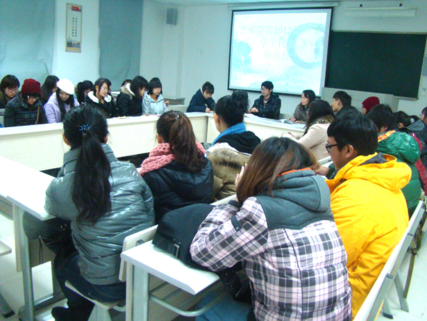 2012年12月21日中午,艺术学院在606—6124召开了2012年期末学生代表座谈会,艺术学院党委副书记陶培之老师、团委卢海栗老师出席了本次会议。