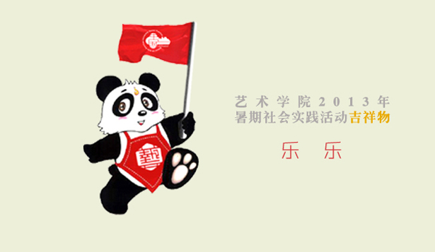 艺术学院暑期社会实践活动继承传统,发扬特色,长期以来,通过视觉识别系统的规范运用,吉祥物在全国的推广,专业性的实践方向,形成了“乐乐听故事,乐乐走中国”的活动品牌。今年,我院暑期社会实践活动根据学校的统一部署,确立了“挑战创新路,共迎中国梦”的活动主题,在暑期社会实践工作领导小组的多次筹备会议、进班级开展宣讲、全院广泛招募队员后,共组建了“文艺下乡巡回展演团”、“惠寒支教志愿服务团”、“美丽中国写生采风团”、“学以致用专业实习团”、“自主创意项目团”五个重点团队,并通过征集与投票选出了艺术学院2013年暑期社会实践活动吉祥物“乐乐”的新形象。吉祥物的整体外观是一只手执红旗,面露微笑的熊猫。画面由红、黑两种颜色组成,简单明快,大方传统,沉稳又不失活泼。面露微笑的熊猫给人以亲切感,展现出我院学子乐于助人,内心阳光的特点,给人以正能量;熊猫前进的姿势意味着不畏艰难勇往直前,不断向前探索的精神。诠释了我院广大青年学生乐于学习,乐于实践,乐于奉献,富于梦想,勇于挑战的积极乐观精神。