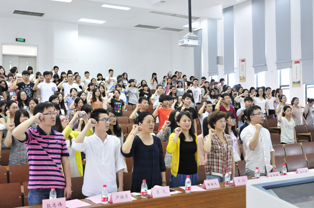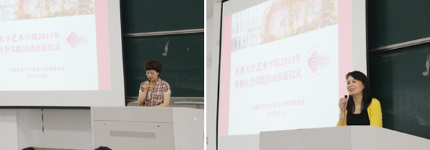 最后,学生代表廖跃春同学领读艺术学院2013年暑期社会实践誓词,全体同学庄严宣誓:我,以一名实践队员的身份,胸怀祖国,心系天下,关注民生,回报社会;我,以一名苏大学子的身份,自强不息,恒志笃行,挑战创新路,共迎中国梦;我,以一名爱国青年的身份,传承五四报国志,坚持科学发展观,构建和谐社会,共创美好明天!