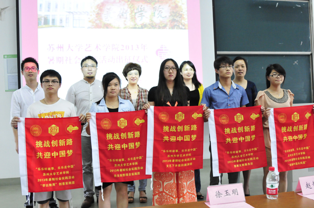 虞岚宣读了艺术学院2013年暑期社会实践重点团队名单,卢海栗宣读了艺术学院2013年暑期社会实践自主创意实践团立项资助项目名单,殷志伟宣读了“院媒助实践”艺术学院2013暑期社会实践活动记者团名单。出席活动的领导嘉宾和老师上台为各重点团队授旗。