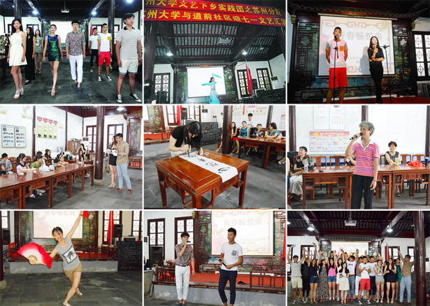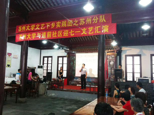 在7月1日这样一个特殊的日子,艺术学院2013暑期社会实践文艺下乡巡回展演实践团苏州分队在道前社区举行了文艺下乡之青春畅想曲暨迎“七一”文艺汇演。演出主要由艺术学院11、12级服装表演班的同学筹办,出席活动的有沧浪区街道办事处副主任许顺、道前社区书记陈戈,道前社区鹿麟书院的各位领导,以及社区的居民朋友们。活动得到了大家的热烈欢迎。