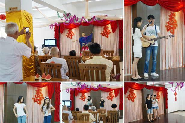 为了给老人带去尽可能多的欢乐和幸福,早在活动开始前几天,同学们就一一了解了老人们的喜好并精心地准备了许多节目。正值七月,骄阳似火,但炎热的酷暑却抵挡不了同学们的热情,同学们怀着激动和喜悦的心情,为老人们送去一场诚挚的演出。老人们也兴致勃勃地围坐在一起观看。苏州话唱的歌曲《秦淮景》曲调悠扬,温婉柔美,尽显江南一带吴侬软语的灵韵;吉他曲 《拥抱》亲切温暖,像和煦的春风,为老人送去关怀;印度的肚皮舞俏皮生动,给老人们十足的活力和热情;民谣串烧《明天会更好》仿佛又带大家回到青涩纯真的青春时代……动听的乐器演奏,美妙的乐曲轮番登场,赢得了老人一阵又一阵雷鸣般的掌声。