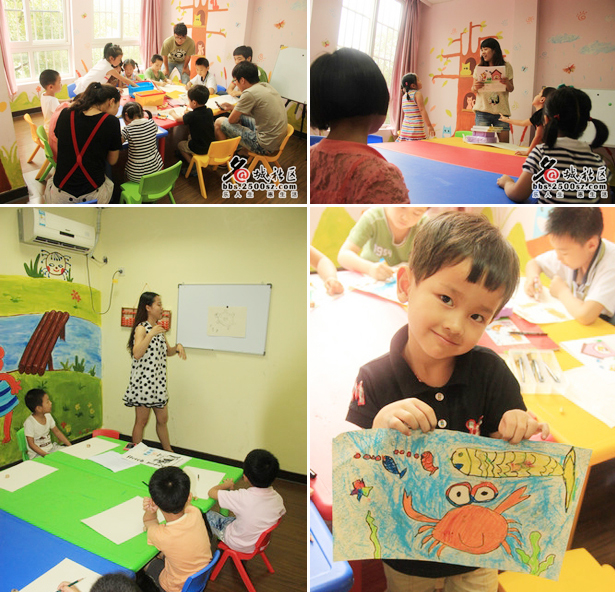 今天儿童画的课程主要是教小朋友们画螃蟹和生活在水中的一些小动物。小朋友们也充分发挥了自己的想象力,有的小朋友画了八只脚的大螃蟹,还有的画了小鱼,海星,和海藻,还有的小朋友更是想象丰富,画理青蛙王子和青蛙公主。课程结束后,小朋友们拿着自己的作品拍照留念。最后支教小组的所有成员和所有小朋友,还有一些家长一起拍照留影。最后小朋友们都依依不舍的离开了,还和老师说再见。这两天的支教活动也都给大家留下了深刻印象。
