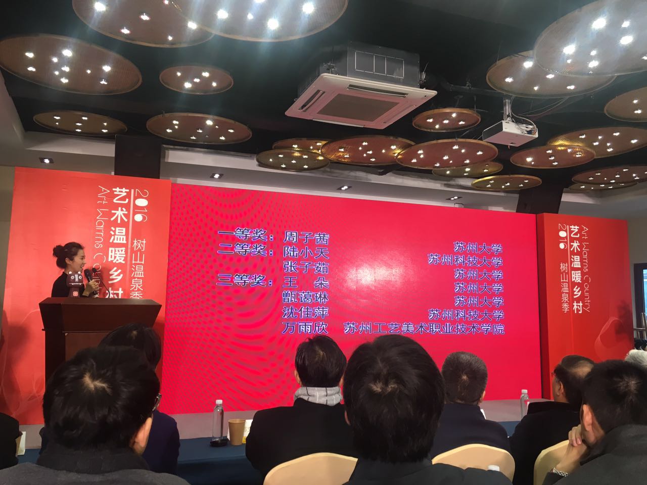 12月19日上午,由乡村规划建设研究与人才培养协同创新中心主办,乡伴文化创意发展有限公司以及苏州新灏农业旅游发展有限公司承办的2016苏州高校“树山守”彩绘邀请赛颁奖典礼在树山村原舍翕厢酒店顺利举行。颁奖典礼上,由我校视传系主任赵志峰老师带领获奖同学进行领奖。我校学生在此次大赛中表现突出,收获奖项颇多:周子茜同学荣获一等奖,张子茹同学获二等奖,王朵、甄蔼琳同学获三等奖。