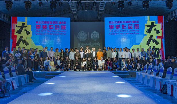 5月24日晚6点半,苏州大学艺术学院2017年毕业设计作品展“大人物”在独墅湖校区602号楼前广场拉开帷幕。出席作品展开幕式的领导和嘉宾有:苏州大学副校长蒋星红女士与校内各相关职能部门和兄弟学院领导,苏州工艺美术职业技术学院院长范卫东、南京艺术学院设计学院院长邬烈炎、南京师范大学美术学院院长刘赦等兄弟院校嘉宾,法国图卢兹大学艺术学院色彩图像研究院院长Céline Caumon教授和Guy Lecerf教授等国际合作单位嘉宾,苏州市发展规划研究院院长李湛、工业园区社会事业局局长姚文蕾等政府部门嘉宾,浙江嘉兴锦霓时装有限公司总经理张锦浩、苏州番茄田艺术校长李伟等校企合作单位嘉宾,江苏吴门雅集文化有限公司总裁、凤凰网总编辑杨小京等友好单位嘉宾。出席活动的还有苏州大学艺术学院院长姜竹松、党委书记王尔东,学院全体领导班子成员与毕业设计指导教师和2017届毕业生代表也参加了活动。