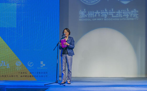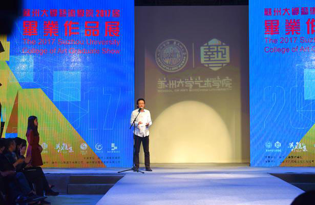 邬烈炎代表兄弟院校发言,他指出,本次苏州大学艺术学院的毕业设计作品给他留下深刻印象,不少作品融合了江南水乡特色,同时突破观念、敢于创新,相信艺术学院在今后的日子里会越办越好。