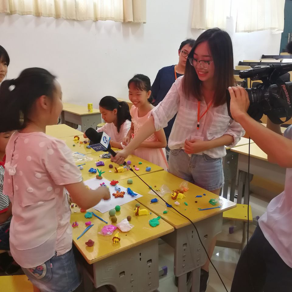 上午的课程是粘土课,当同学们看到主讲老师徐新萍拿出一包包色彩艳丽的粘土时,脸上尽是兴奋的神情。课堂开始后,先让每个孩子先去感受一下粘土的质感,之后以有奖竞答的方式让他们去总结粘土的特性。随后播放了一个小视频,老师让同学们跟着视频的节奏一起完成视频里面的卡通狮子。接下来便是本堂课的重点:小组用粘土工具制作一个小场景。刚开始孩子们并不理解,但在成员们的细心指导下,海底世界、动物园、快餐店等一个个有趣的场景都被孩子们想出来了。