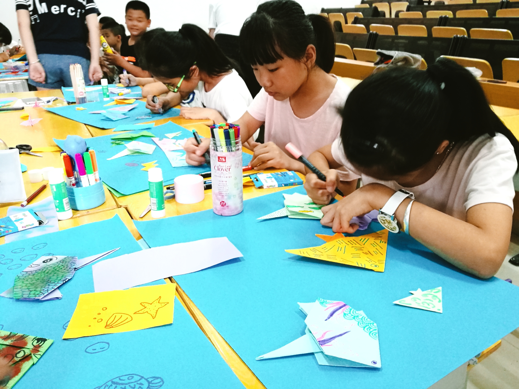 下午的课程是由沈孟宸主讲的剪纸课,主题是海洋生物。沈孟宸老师用投影仪来演示了如何用彩纸折成各种不一样的海洋生物的造型,同学们不仅跟着视频在老师的指导下折出了作品,还在原有的基础上为自己的小生物画上独特的花纹,制作一个属于自己独一无二的作品。最后,全体同学把自己所做的各种海鱼、虾、蟹、海藻等统一贴在一幅海蓝色的卡纸上,形成一幅海底世界的景象。 此次支教活动以“奏响青春,美在心灵”为主题,不仅提高了大学生学以致用,学有所用的社会实践能力,还使当代大学生更加明确了历史所赋予的社会责任,进一步树立关注社会底层、服务人民群众的意识,达到了让学生“受教育、长才干、做贡献”的社会实践目的。                        艺术学院“惠寒”支教服务团福建三明分队                                           艺术学院新闻中心