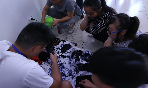 一开始同学们对扎染并不了解,但当团队的负责人向学生们展示了扎染的历史背景、发展过程以及如何扎染后他们对其都产生了十分浓厚的兴趣。扎染的工艺特点是用线在被印染的织物打绞成结后再进行印染,然后再将打绞成结的线拆除的一种印染技术。所以扎染工艺主要分为扎结和染色两个部分。在布料选好之后,首先,按花纹图案要求在布料上分别使用撮皱、折叠、翻卷、挤揪等方法,使之成为一定形状;其次,用针线一针一针地缝合或缝扎,将其扎紧缝严;然后,将缝合好的染布浸水拧干,放入染料;最后,进行拆线,打开即可。接下来的实践操作课程中同学们都积极参加,三五成群地在一起扎染,不会的就向队员们虚心的请教,有些同学们甚至忙得连吃饭都忘记了。最后,实践的结果都取得了不错的效果。