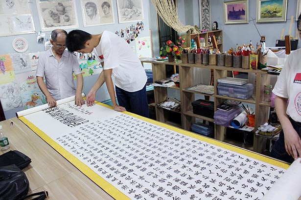 第一天的教学内容是油画棒自由创作,小朋友们可以大胆涂鸦随心作画。待画材分发完后,他们便开始认真画画。俗话说一千个读者里有一千个哈姆雷特,不同小朋友对于画画的想法也是各抒所见的。因此,针对孩子的特殊个性也会进行因材施教的教学形式,每个队员都耐心地对待着每一个学生,并相处得愉快和谐。下课后,队员们有幸与书法大师卢言书进行了艺术交流,老师亲切地指导了学习书法艺术的方法以及方向,还带团队欣赏他的个人作品----用七种不同字体书写的岳阳楼记的卷轴。看着这满屏的墨香纵横,有的龙飞凤舞有的整洁规范,队员们纷纷表示赞叹。