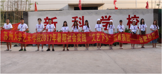 2017年7月10日,苏州大学艺术学院暑期社会实践“文艺下乡”巡展演团小分队来到安徽省合肥市开展以“宣传艺术多元化,体验缤纷社会”为主要议题的暑期社会实践活动。 为期8天的实践活动中,这群激情四射、充满艺术活力的90后大学生们结合自身的特长,不顾烈日酷暑,在合肥新科教育美术培训中心给高一学生教授了扎染技艺,激发大家对艺术的热爱和对非物质文化遗产的重视。在南艳湖公园,向游客宣传了手绘公园艺术并在现场适宜的地方进行了绘画创作。精彩的画作把单调的路面、孤零零的鹅卵石、黑漆漆的井盖变得生动活泼,富有情趣。通过这些活动,学生和市民了解了传统艺术和现代艺术知识、艺术与生活的紧密联系,提高保护非物质文化遗产意识。他们还在蜀山区为当地群众献上了一台内容丰富多彩的文艺演出,收获了现场观众的阵阵掌声。 蜀山区文艺演出