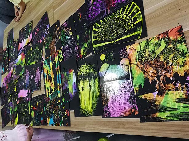 7月18日,艺术学院“文艺下乡”巡展实践团湖南岳阳分队是活动进行的第二天。为了增强活动的趣味性、互动性以及孩子们的动手实践能力,团队特地准备了与寻常不同的绘画课程——刮画。用小木棒在一张特殊的纸上刮掉图层,创作的作品就可以露出底下五彩斑斓颜色。刮画不仅可以吸引小朋友,使他们有兴趣兴趣,还可以使他们充分发挥想象力。