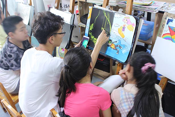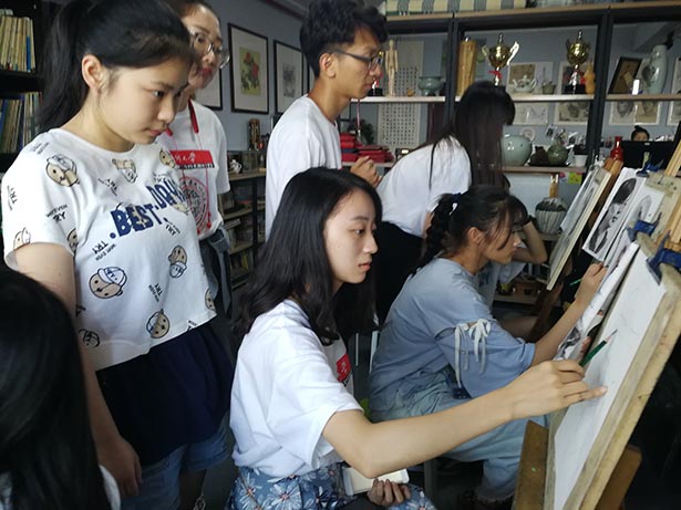 活动开始的时候,队员们先为每组的小朋友做了示范,教他们如何使用刮画纸与小木棒。接下来便是孩子们发挥天马行空的想象力自己进行作画的时间了,在队员们的指导下许多有趣并且高质量的作品源源不断地诞生。最后,学生们的画作都被收集起来,并由各自的指导老师逐一进行评讲与鼓励。看着孩子们开心满足的笑容,队员们内心也感受到了甜到心窝里的温暖。另外课程结束后,队员们还指导了即将艺考的高三学生们,不仅为他们做了范画也教授了一些考试经验,并给予他们力量。