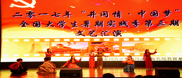 8月3日晚,“井冈情·中国梦”全国大学生暑期实践季专项行动(第三期)文艺汇演在团中央井冈山教育基地报告厅举行。来自浙江大学、西安交通大学等16所高校大学生联和献出了一台精彩的演出,苏州大学艺术学院“井冈逐梦”暑期社会实践团队11名师生也积极参与其中。来自全国各地的200多名大学生齐聚一堂,不仅以各具民族特色和地域特色的节目展现出同学们的青春风采,也同时诠释了“井冈情·中国梦”的主题。内蒙古师范大学以一首女生独唱,赢得了观众的热烈掌声,来自西藏职业技术学院的藏族同学身着民族服饰,表演了一场精彩绝伦的舞台剧,将本场晚会的气氛推向高潮。艺术学院“井冈逐梦”暑期实践团队成员们以“悠悠苏大,墨染井冈”为主题,用“歌曲合唱+书画展示”的形式来展示苏州大学的文化底蕴,同时,成员们也用了他们在井冈山创作的绘画作品来诠释井冈山精神。