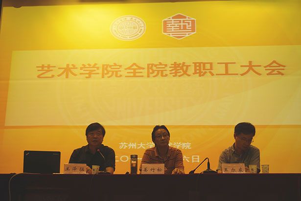 2017年9月6日下午,艺术学院全院教职工大会在艺术学院601音乐厅举行。会议由艺术学院院长姜竹松,副院长王泽猛、王尔东主持召开,艺术学院全体教职工参与本次会议。