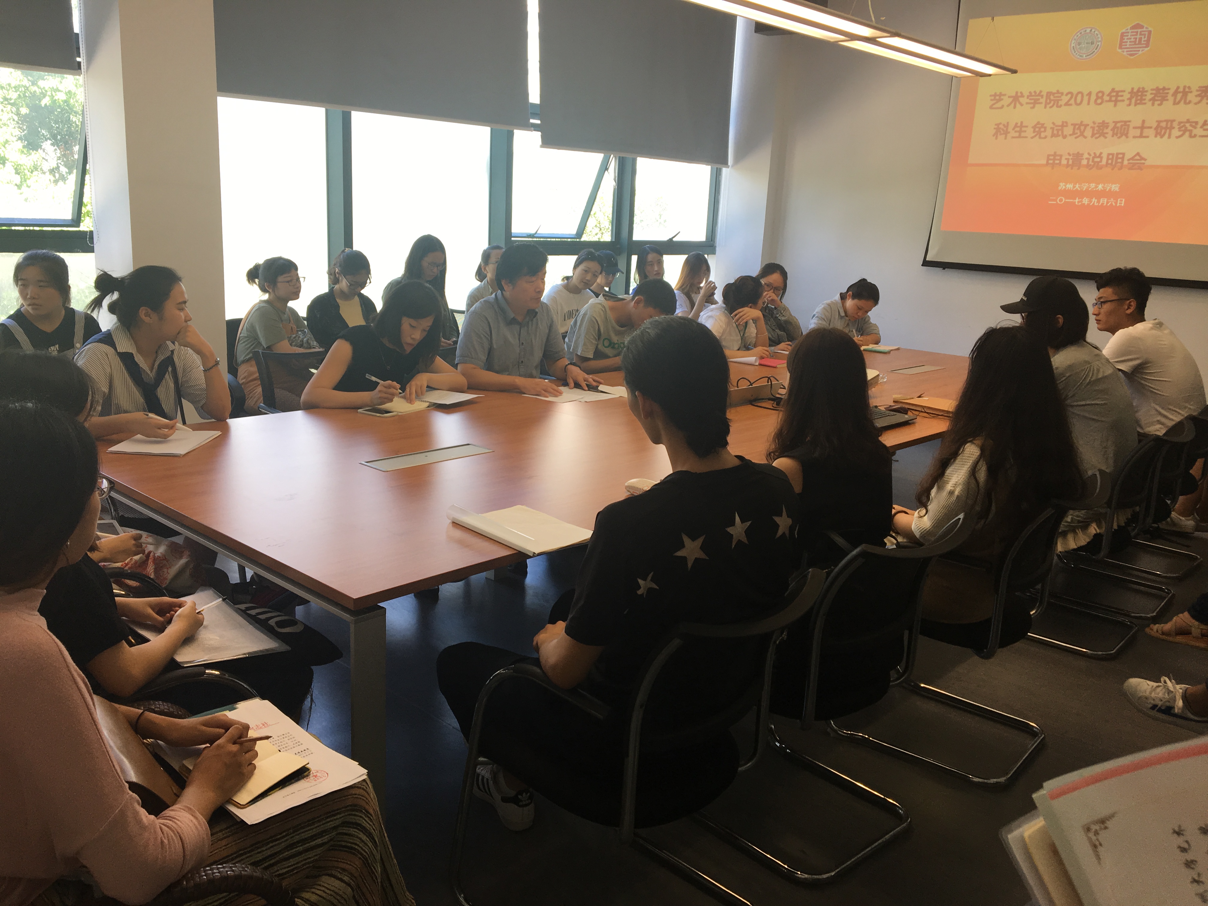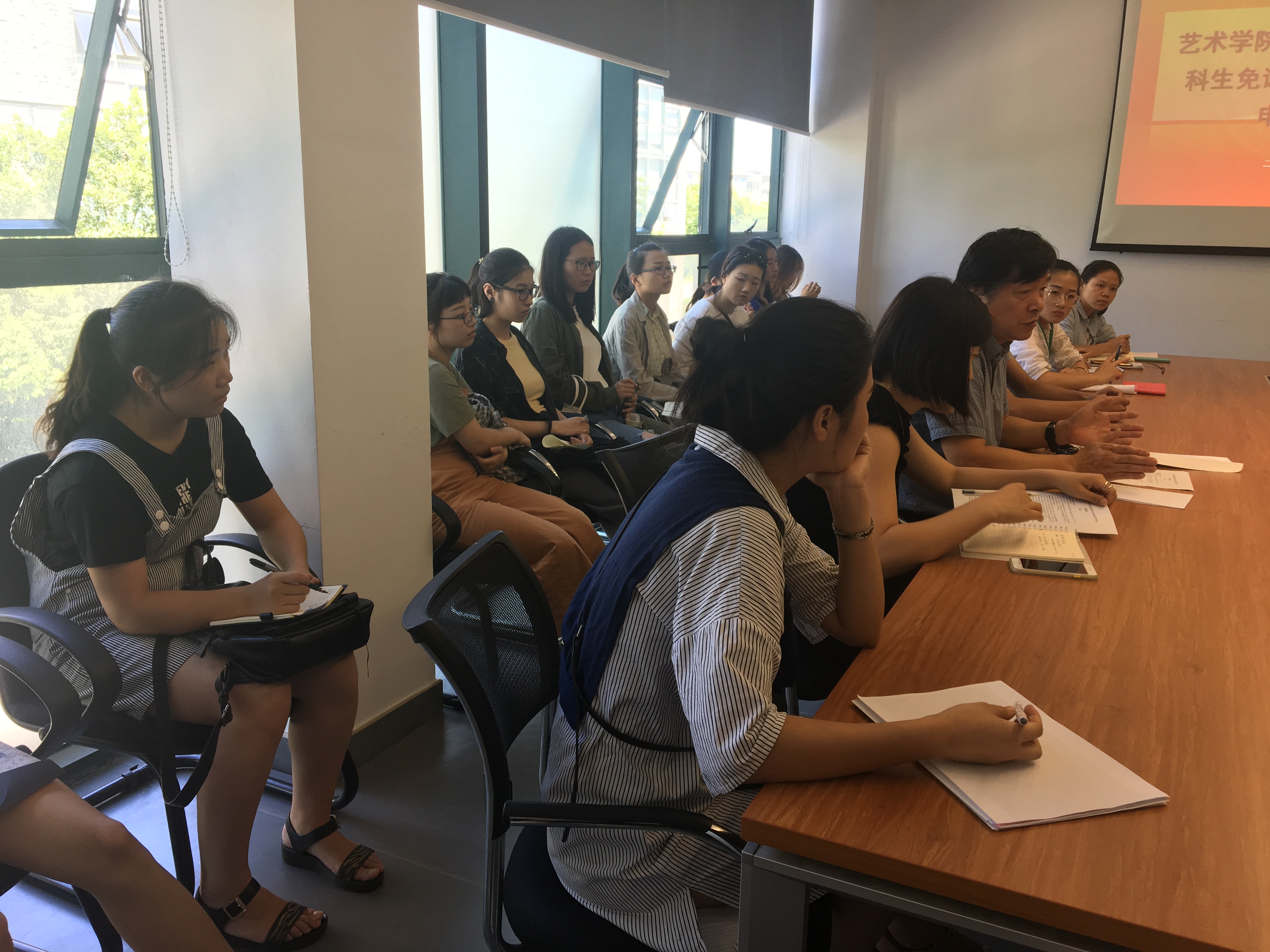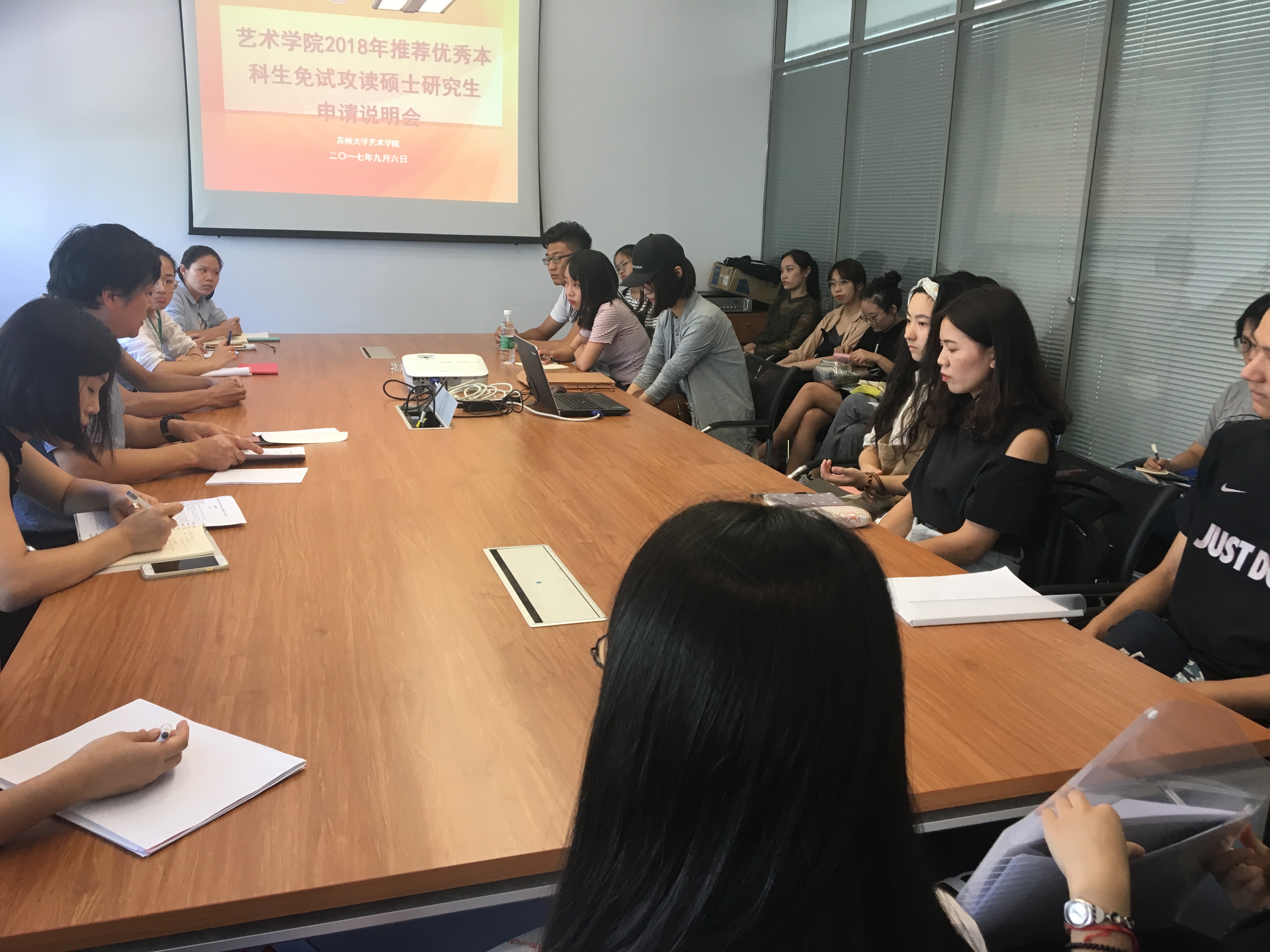 2017年9月13号12:30,我院在602二楼会议室举行了推荐2014级优秀本科生免试攻读硕士研究生的申请说明会活动。艺术学院副院长王泽猛教授,本科生秘务秘书宋敏老师出席本次会议,2014级各个专业申请保研的本科生参加了本次会议活动。