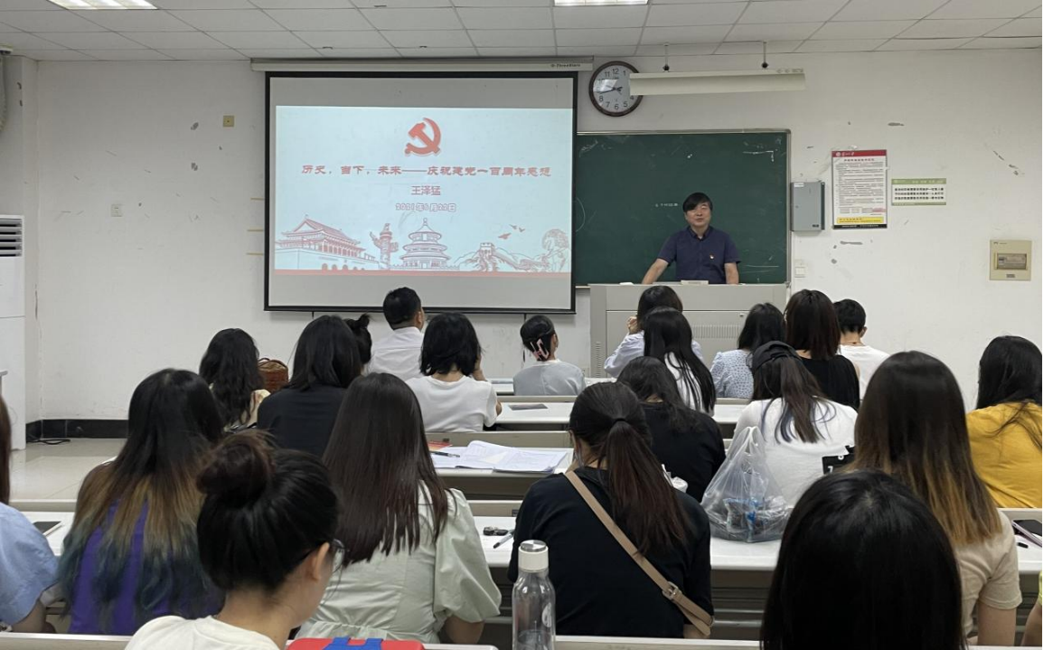 接下来开展党史集中学习研讨。学院党委纪检委员王泽猛老师给同学们带来题为“历史,当下,未来——庆祝建党一百周年感想” 的党课。王老师从自身的实际事例,专业教学中的感受以及中美关系的方面,让同学们能够更真实的了解学习党史。教师代表仇松莹老师、学生代表李宗豫、曲艺彬同学共同带领同学们阅读党史著作,分享学习心得。