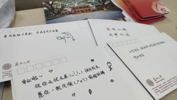 在临别赠言——未来可期环节,李旸老师通过对近三十年来国内的科技发展和杰出人物等介绍,希望同学们能够发挥自身优势,做好自己的人生时间表;仇松莹老师则从青年学子的角度,希望同学们能够大有作为,肩负起时代赋予的重任。集体在苏大专属明信片上互留赠言,寄托祝福。