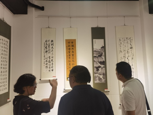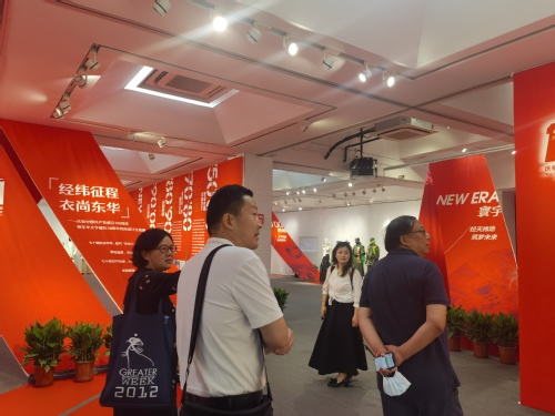 东华大学服装与艺术设计学院党委书记吴晶向来宾展示东华大学师生为庆祝中国共产党成立100周年创作的服装设计作品。联盟高校师生互相交流党史学习教育工作经验和学习成果。