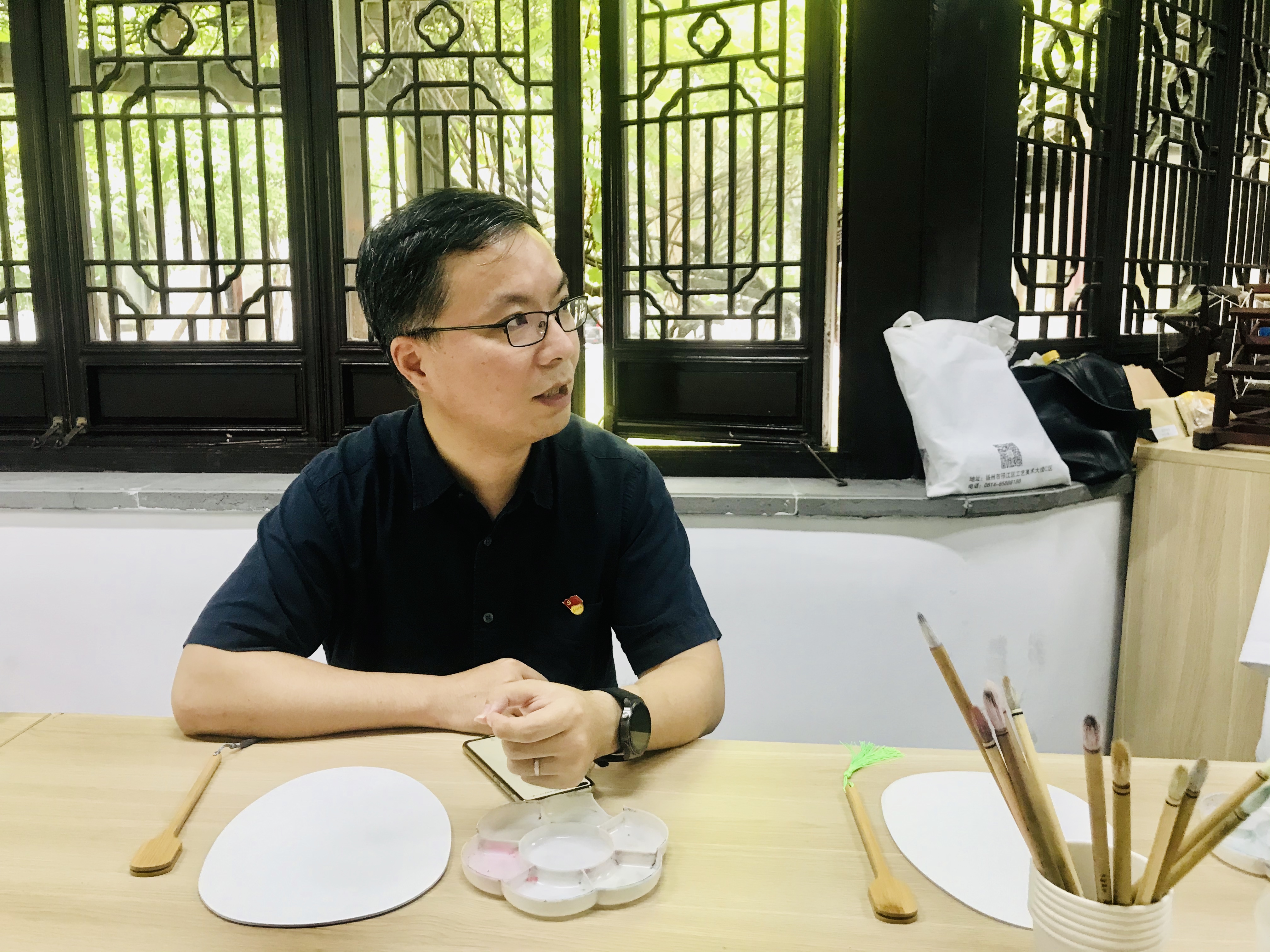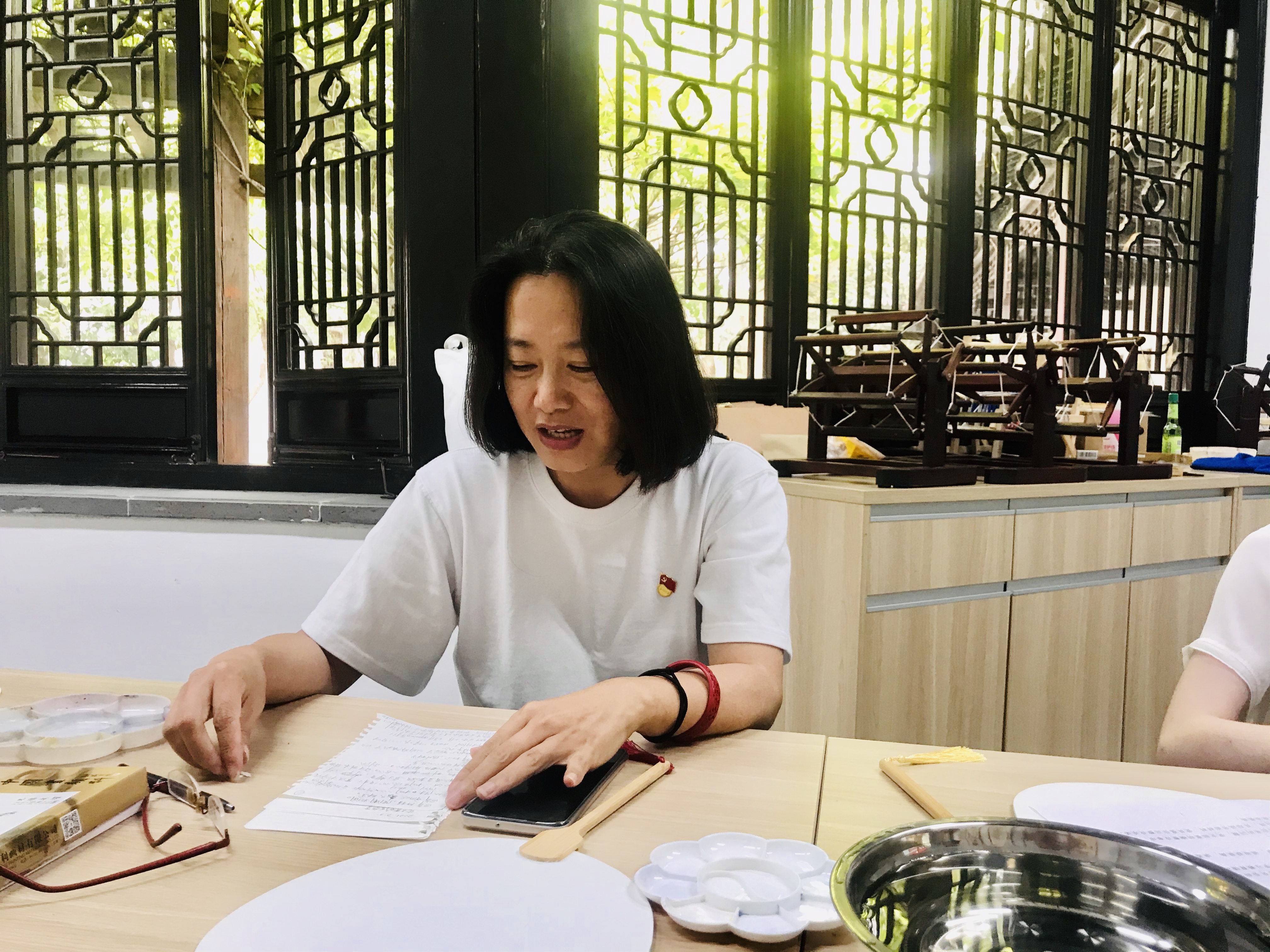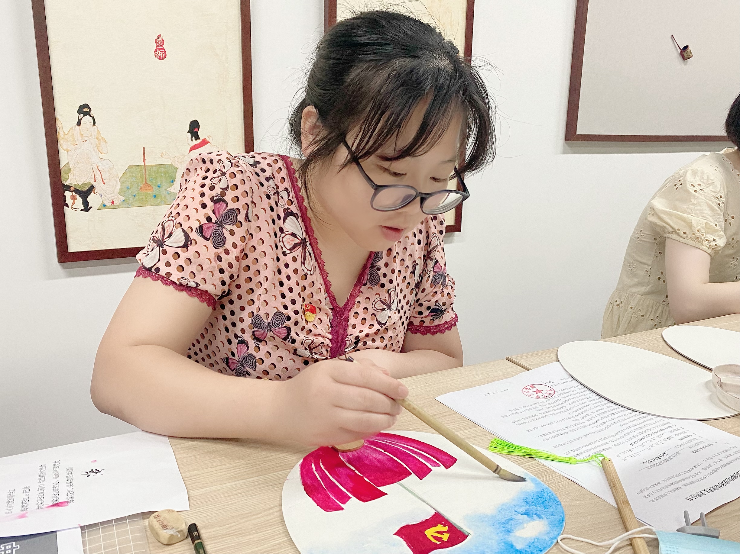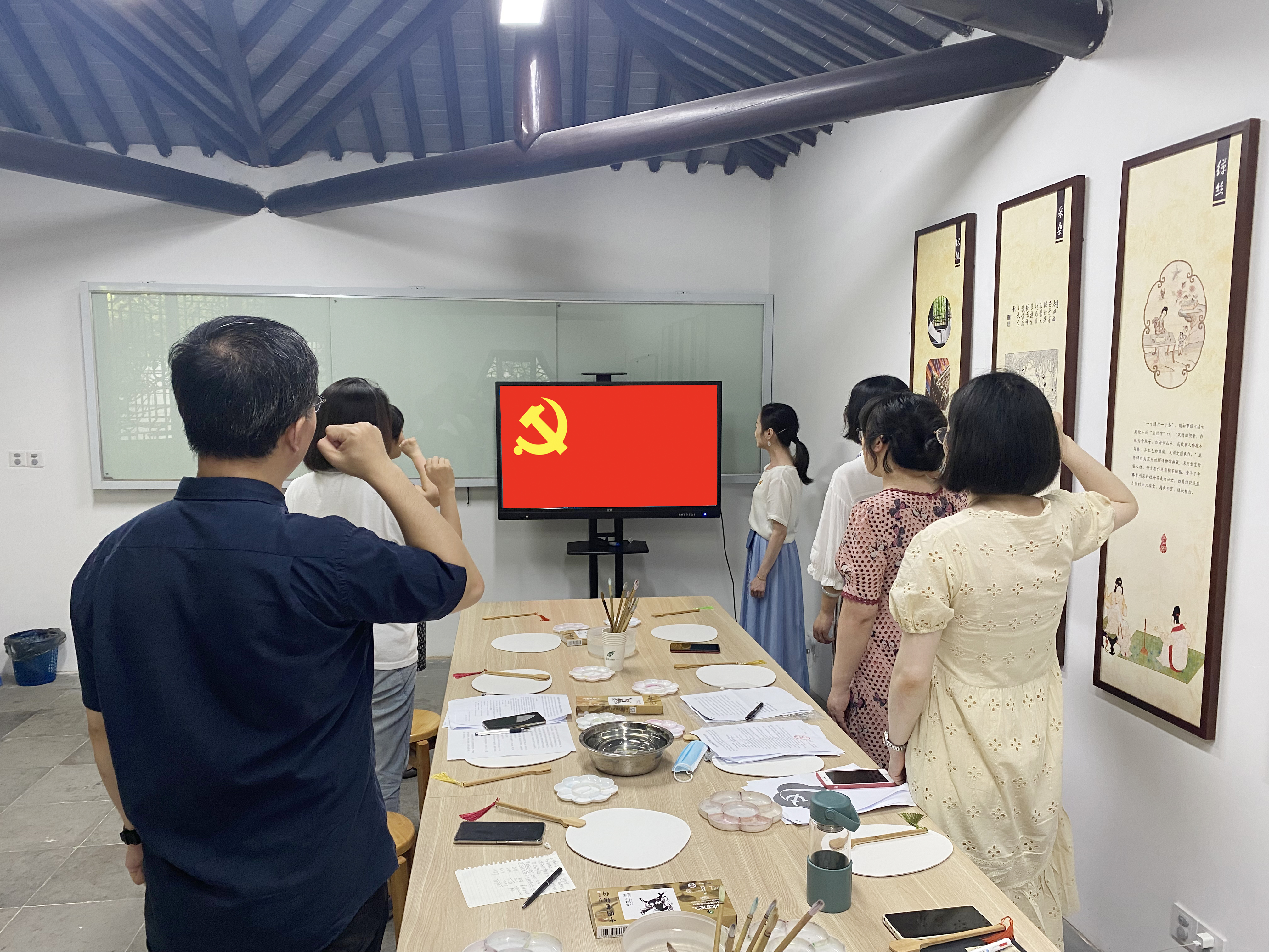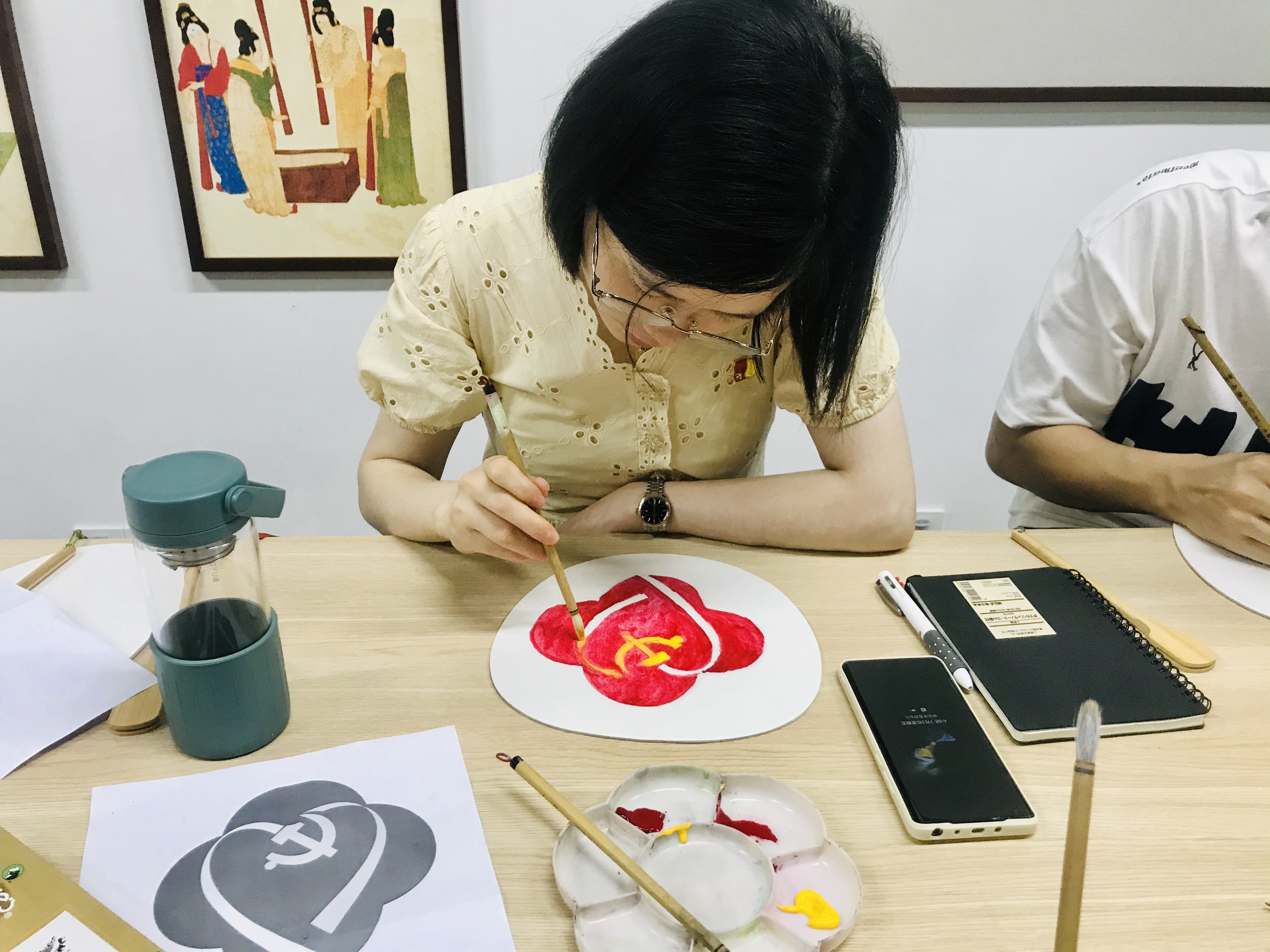 最后一个环节是画扇活动,绘画的主题是“海棠花红”。“海棠花红”是苏州基层党组织先锋阵地统品牌标识。 标识图案以苏州园林的花窗造型为轮廓,形似海棠花;以正红色为底色,以党徽为中心,以党徽两侧的飘带构成-个心形,将园林花窗这一苏州地方文化元素与党徽这一党的鲜明标志有机结合、 水乳交融。“海棠花红” 品牌寓意着苏州各级党组织和广大党员对党的“ 赤诚之心”“不忘初心”和“卓越匠心”,体现着苏州各级党组织和广大党员坚决维护习近平总书记在党中央和全党的核心地位,坚决维护党中央权威和集中统一领导,在思想上政治上行动上同以习近平同志为核心的党中央保持高度一致,为苏州勇当“两个标杆”、争当建设“强富美高”新江苏先行军排头兵提供坚强组织保证。