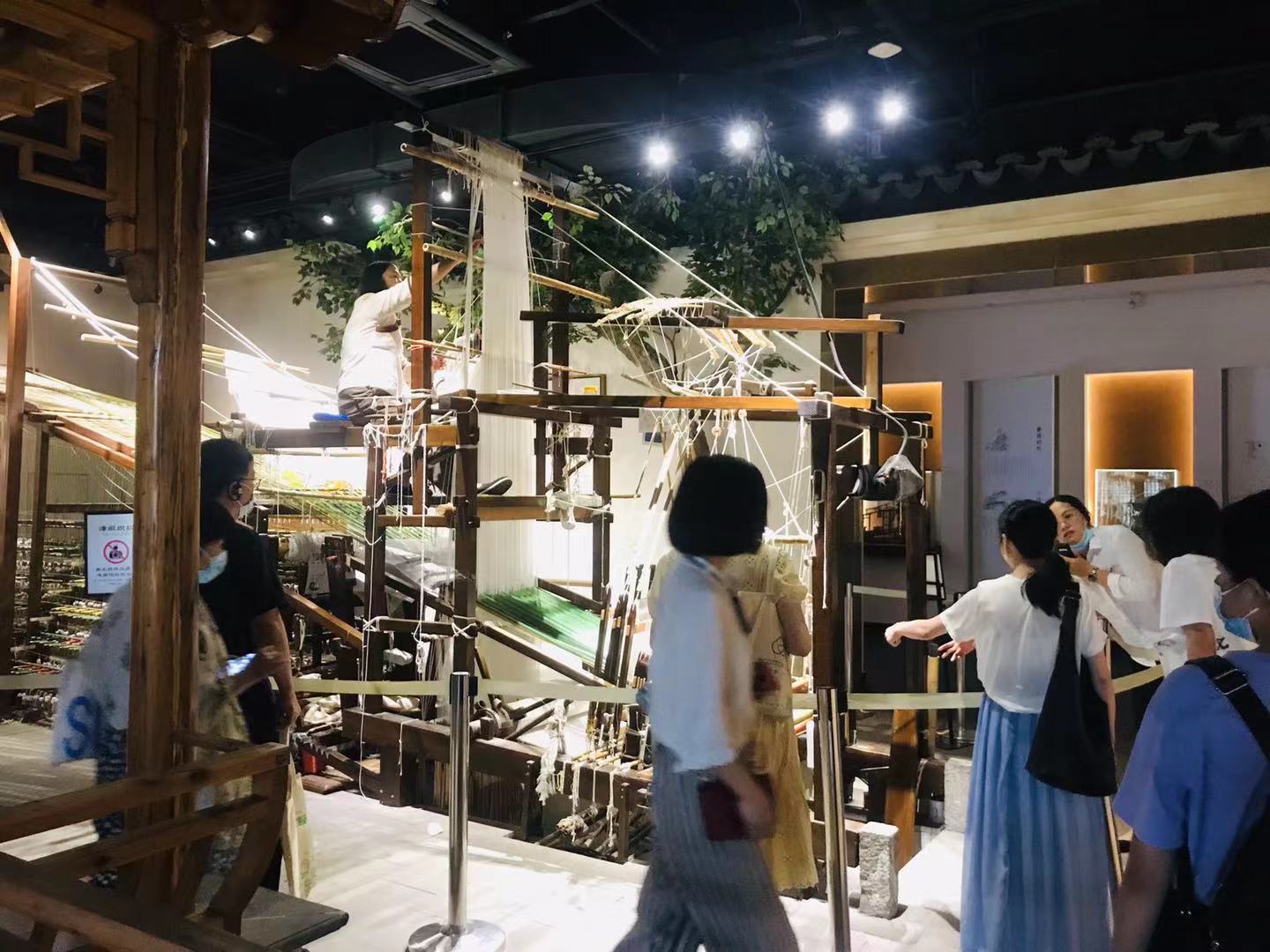 接下来我们跟着讲解员参观了丝绸博物馆的常设管,从序厅、古代馆、蚕桑居、蚕乡农家和桑林草亭、中厅、近代馆(明清一条街)到现代馆(锦绣苑)。在蚕桑居内的养蚕现场,我们被一条条可爱的蚕宝宝吸引住了,还参观了传统的手工织宋锦展示,被复杂的机器构造和我们古代劳动人民的智慧所惊艳。