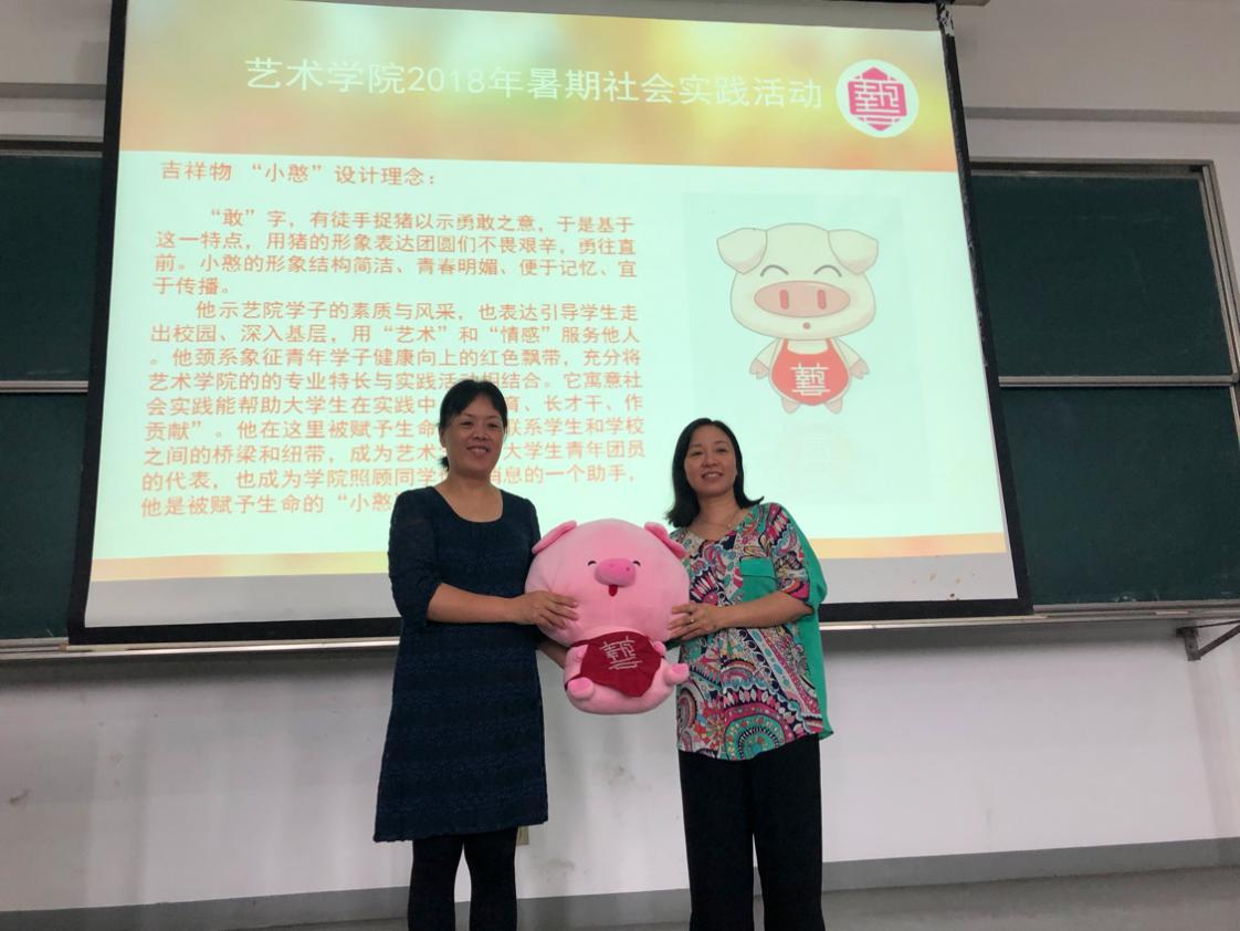 接着,由张洁老师和虞岚老师共同揭晓了本年度的暑期社会实践吉祥物——小憨,并与小憨合影留念。小憨以2019年猪年的小猪为形象,希望苏大艺术学院的学子们在暑期社会实践中能有不畏艰辛,勇往直前的意志。