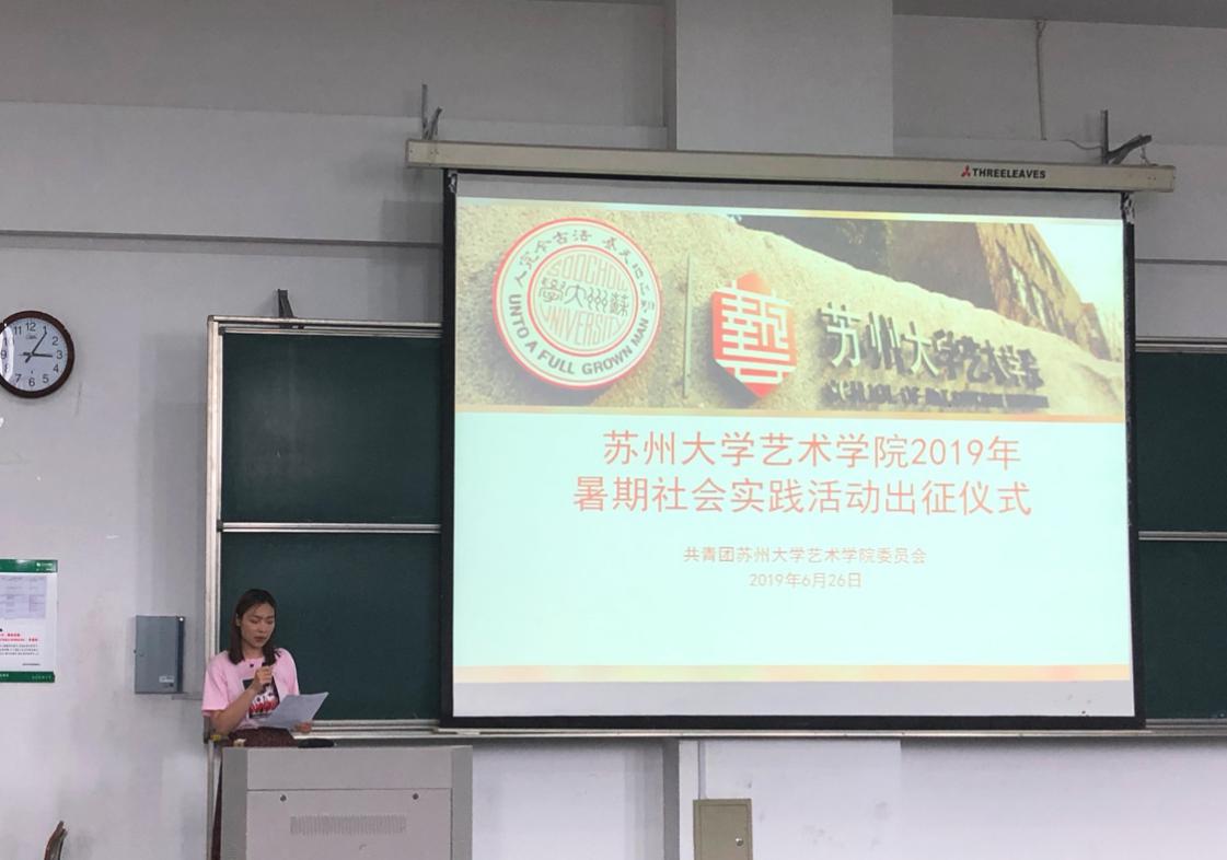 2019年6月26日下午三点,苏州大学艺术学院2019年暑期社会实践活动出征仪式于苏州大学独墅湖校区301-1219教室顺利举行。艺术学院党委副书记、副院长张洁,艺术学院学工办主任虞岚,艺术学院团委书记沈院生,艺术学院辅导员贾扬娣,艺术学院辅导员赵胜楠以及暑期社会实践各项目负责人、学生代表等出席仪式,出征仪式由艺术学院分团校理事长叶一婷主持。