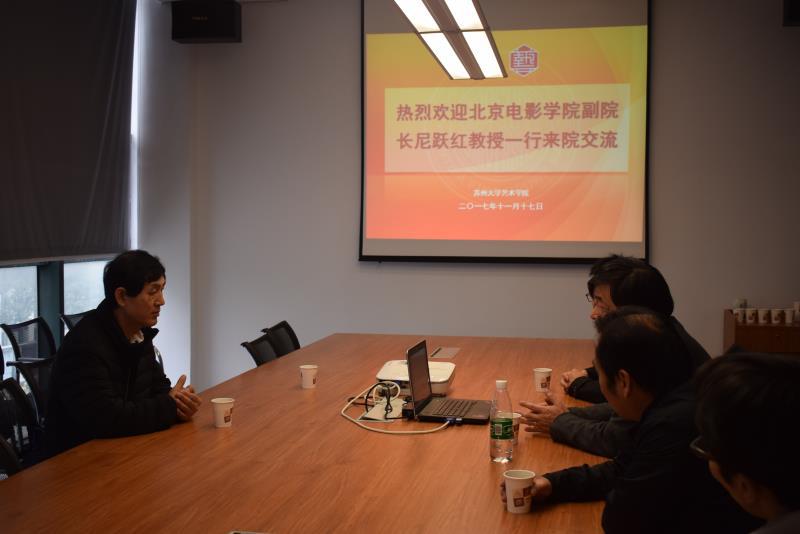 首先,王泽猛教授对苏州大学艺术学院的发展历史以及发展现状进行了简明的阐述,并同时分析了艺术学院各个专业的发展前景。随后,北电副院长尼跃红教授亦对北京电影学院目前的教育模式和发展进程做了简单介绍。此外,双方还围绕着各自学院专业理论与实践水平的高低、专业项目研究进展、人才引进策略等问题进行了深入的交流与探讨。相应的,两位教授也就双方潜在的合作方式交换了意见,从而搭建起两校沟通和学习的桥梁。